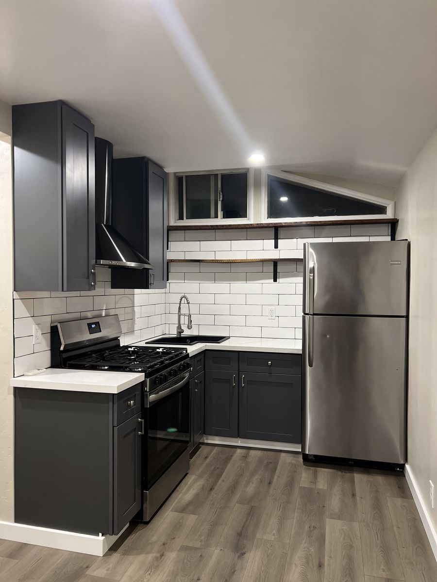 The apartment features a modern kitchen with stainless steel appliances, a gas stove, and an energy-efficient mini-split heating and air conditioning system for year-round comfort.